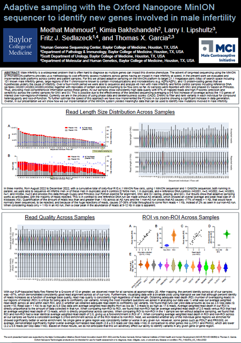 Male infertility is a widespread problem that is often hard to diagnose as multiple genes can impact this diverse phenotype. The advent of long-read sequencing using the MinION or PromethION platforms provides us a methodology to cost efficiently assess mutations across genes having an impact in male infertility at speed. In the present work we evaluated and implemented both platforms across control and patient samples. For this we utilized adaptive sampling on the MinION platform to target 21.1 megabase pairs (Mbp) of search space including 101 known male infertility genes, large regions of the Y chromosome known to contain microduplications and microdeletions (e.g. AZFb/AZFc), and 13 protein-coding genes that we hypothesize underly the cause of infertility. Over a four-month period we were able to sequence and analyze 48 men with male infertility and fertile control samples including reference DNA samples (HG001,HG002,HG003,HG004) together with replicates of certain samples amounting to 64 flow cells so far. All samples were reported with SNV and phased SV based on Princess. Thus, providing most comprehensive information across these genes. All our samples show consistently high data quality with 97% of mapped reads and high F-scores (precision and sensitivity) across the control samples for SNV and SV. This is possible due to the effectiveness of the selected sequencing averaging a 5-6 fold increase of coverage across the 113 genes of interest over non-regions-of-interest. Currently we are in the process of using phase data and deleteriousness scores (CADD, DANN) to filter and rank variants in each individual for compound heterozygosity and loss-of-function. To further optimize the speed of this approach we have now implemented the P2-solo in our pipeline showing a significant increase in data generation. Overall, in our presentation we will show how we our implementation of the MinION system yielded meaningful data that can be used to identify new mutations involved in male infertility.
