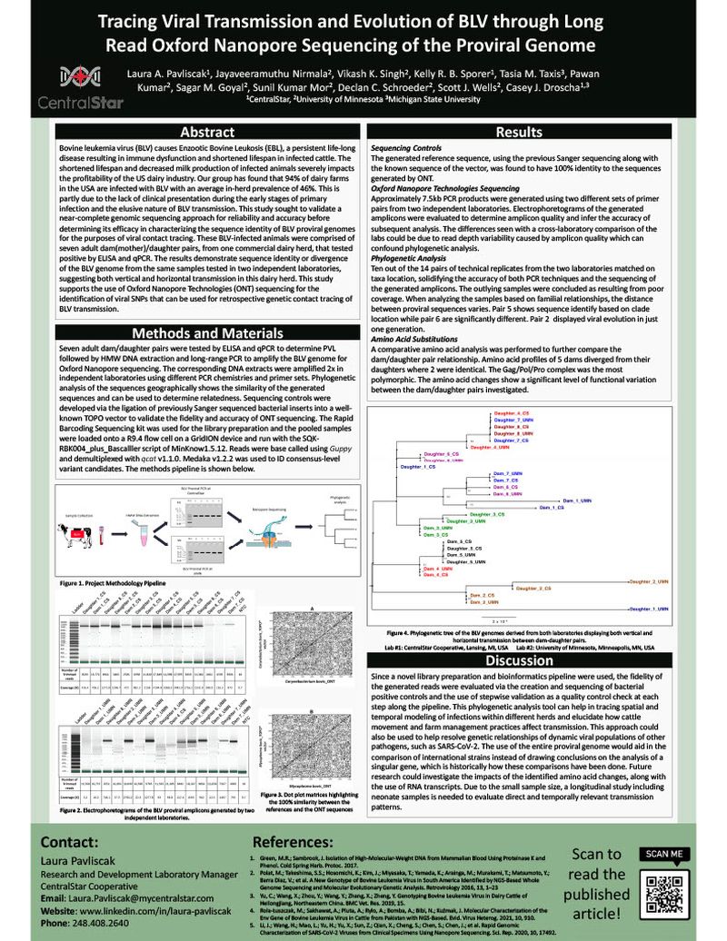Bovine leukaemia virus (BLV) causes Enzootic Bovine Leukosis (EBL), a persistent life-long disease resulting in immune dysfunction and shortened lifespan in infected cattle. The shortened lifespan and decreased milk production of infected animals severely impacts the profitability of the US dairy industry. Our group has found that 94% of dairy farms in the USA are infected with BLV with an average in-herd prevalence of 46%. This is partly due to the lack of clinical presentation during the early stages of primary infection and the elusive nature of BLV transmission. This study sought to validate a near-complete genomic sequencing approach for reliability and accuracy before determining its efficacy in characterising the sequence identity of BLV proviral genomes for the purposes of viral contact tracing. These BLV-infected animals were comprised of seven adult dam(mother)/daughter pairs, from one commercial dairy herd, that tested positive by ELISA and qPCR. The results demonstrate sequence identity or divergence of the BLV genome from the same samples tested in two independent laboratories, suggesting both vertical and horizontal transmission in this dairy herd. This study supports the use of Oxford Nanopore Technologies (ONT) sequencing for the identification of viral SNPs that can be used for retrospective genetic contact tracing of BLV transmission.