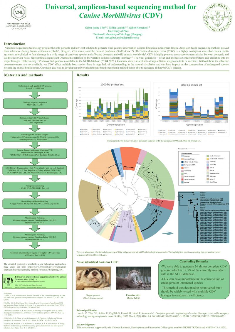 Nanopore sequencing technology provide the only portable and low-cost solution to generate viral genome information without limitation in fragment length. Amplicon based sequencing methods proved their relevance during human epidemics (Ebola1 , Dengue2 , Zika virus1 ) and the current pandemic (SARS-CoV 2). The Canine distemper virus (CDV) is a highly contagious virus that causes multisystemic, sub-clinical to fatal diseases in a wide range of carnivore species and affecting domestic and wild animals worldwide. CDV is highly prone to cross-species transmission between domestic and wildlife reservoir hosts, representing a significant One Health challenge on the wildlife-domestic animals interface. The viral genome is ~ 15 kb and encodes six structural proteins and classified into 18 major lineages. Hitherto only 195 almost full genomes available in the NCBI database (27.04.2022.). Genomic data is essential to design efficient diagnostic tests or vaccines. Without these the effective counter measures are not available. As CDV affect multiple host species there is huge lack of understanding in the natural circulation and can have impact on the conservation of endangered species beyond the animal health issues. Our main goal was to develop an universal amplicon-based sequencing method that is able to sequence all known CDV lineage.